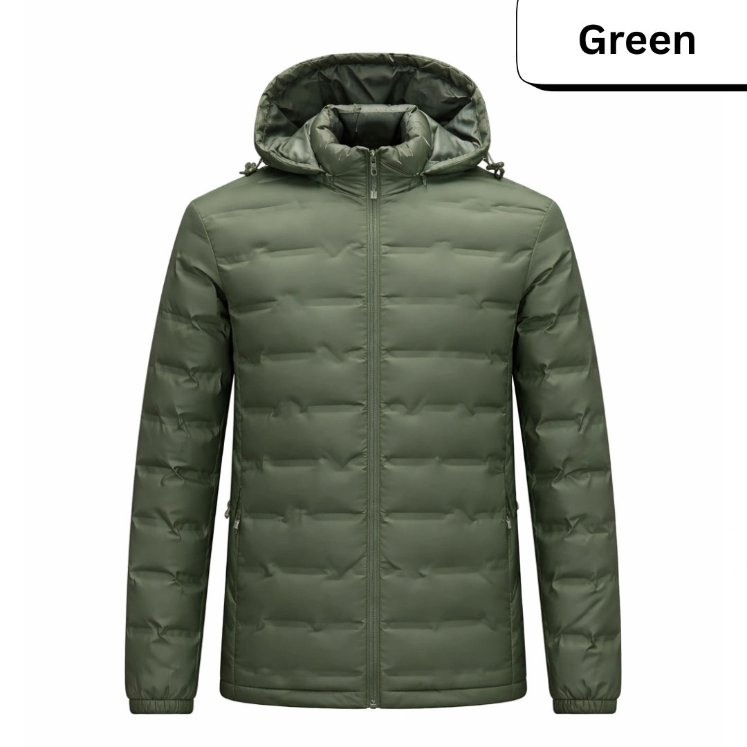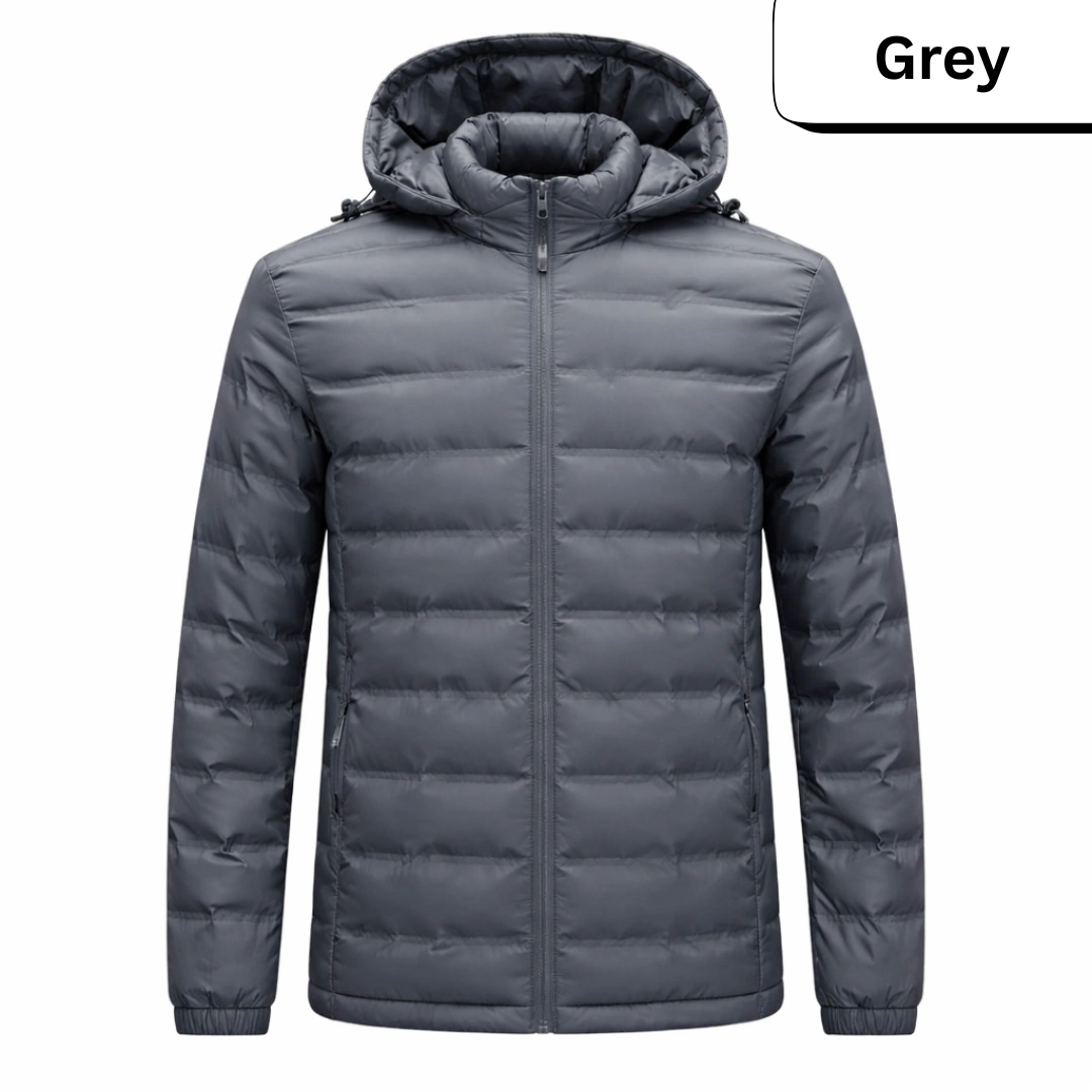 A lightweight yet warm hooded puffer jacket designed for everyday winter wear. Quilted insulation, full front zipper, and elastic cuffs lock in heat, while the smooth water‑resistant shell helps keep you dry in light rain or snow. Available in classic solid colours: black, navy, grey, and army green.